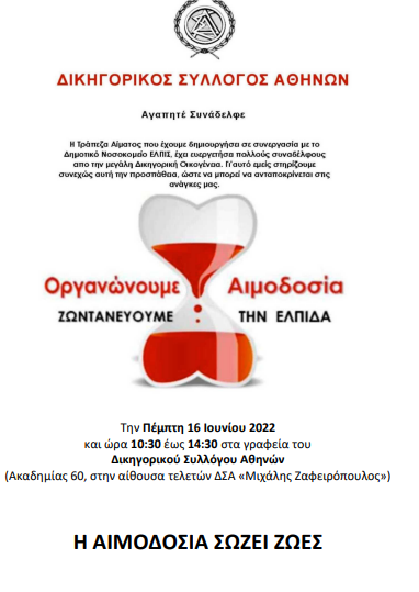 Εθελοντική αιμοδοσία διοργανώνεται την Πέμπτη 16 Ιουνίου από τις 10.30 έως τις 14.30, στα γραφεία του Δικηγορικού Συλλόγου Αθηνών (Ακαδημίας 60, στην αίθουσα τελετών «Μιχάλης Ζαφειρόπουλος».