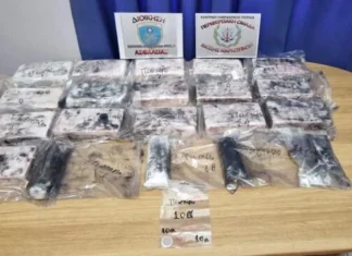 Είκοσι συσκευασίες με κοκαΐνη συνολικού μικτού βάρους 17,598 κιλών, εντοπίστηκαν σε πλοίο μεταφοράς εμπορευματοκιβωτίων στον Πειραιά.