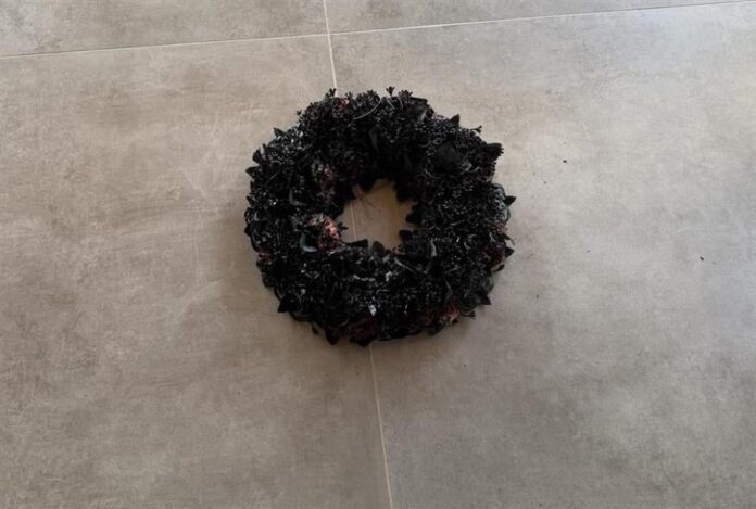Ιδιαίτερη βαρύτητα δίνεται στο μαύρο στεφάνι που εντοπίστηκε στην κεντρική είσοδο της μεζονέτας — σύμβολο “προειδοποίησης” που παραπέμπει, σύμφωνα με τις αρχές, σε ενέργεια με ξεκάθαρο προειδοποιητικό χαρακτήρα.