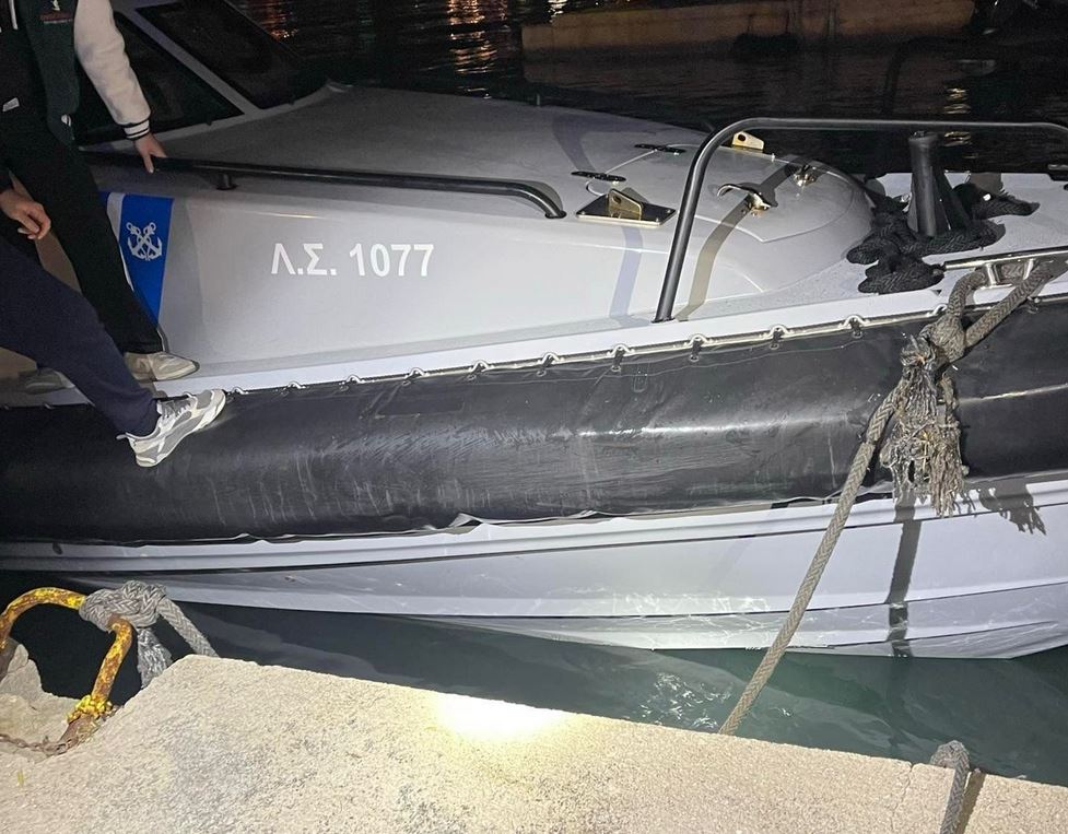 Μάλιστα, το Λιμενικό έδωσε στη δημοσιότητα και φωτογραφίες του φουσκωτού περιπολικού σκάφους, στις οποίες διακρίνεται το σημείο πρόσκρουσης στη δεξιά πλευρά.
